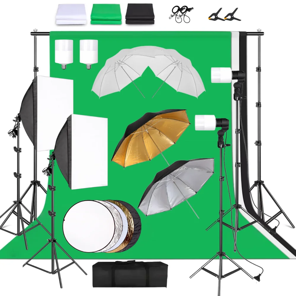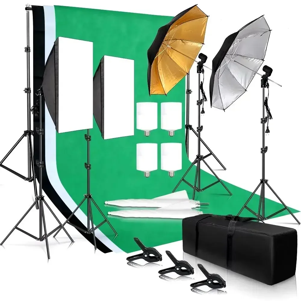 Kit Estudio Fotografía — Softbox, Fondos, Paraguas, Reflector, Soportes y Bombillas LED